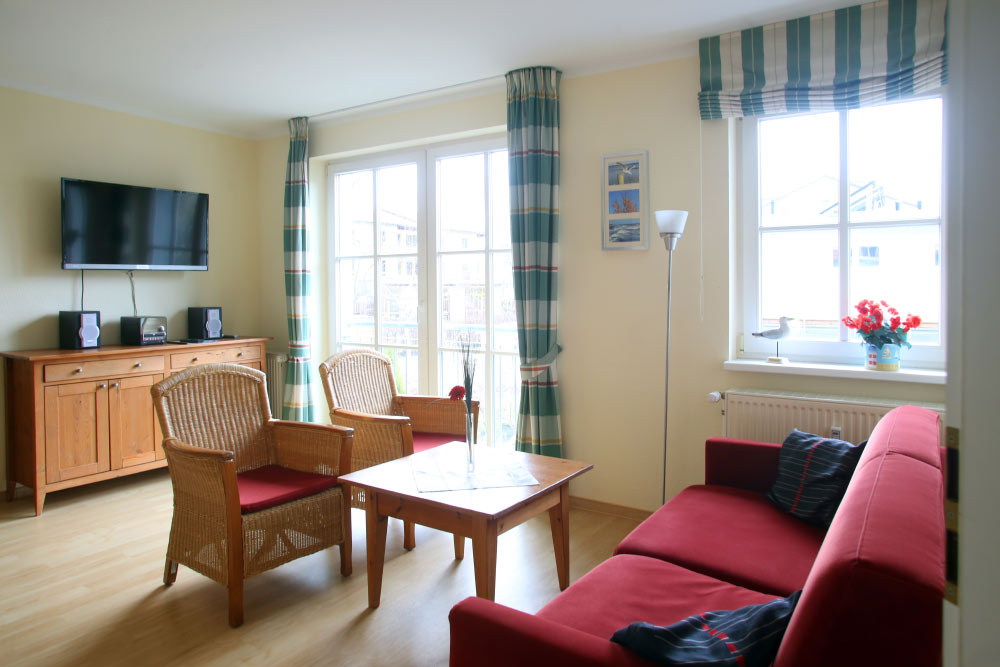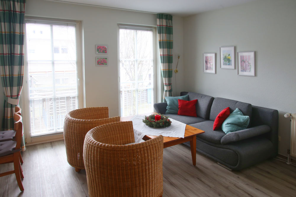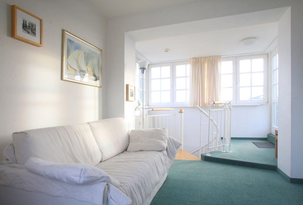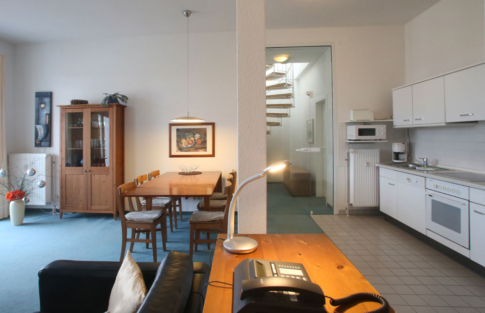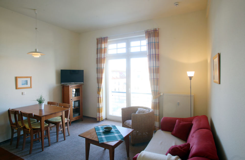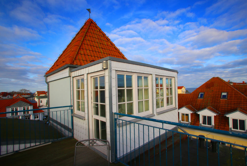 Eine große Maisonettewohnung mit Blick auf die Ostsee von der Dachterrasse steht Ihnen im Dachgeschoss unserer Appartementanlage zur Verfügung. Die Wohnung ist etwa 80 m² groß und verfügt über einen großen Wohnbereich mit offener Küche und Essbereich und Balkon. Hieran schließen ein Schlafzimmer mit Doppelbett an, welches ebenfalls über einen Balkon verfügt, und ein modern eingerichtetes Bad mit Eckbadewanne. Über eine Wendeltreppe erreichen Sie das Turmzimmer, welches mit einer Schlafcouch ausgestattet ist. Über das Turmzimmer gelangen Sie auf die große Dachterrasse über den Dächern von Kühlungsborn mit herrlichem Rundumblick. Die 3-Zimmer-Appartements verfügen über einen Wohnraum mit vollausgestatteter Küchenzeile, ein Schlafzimmer, ein Kinderzimmer mit Doppelstockbett sowie ein Badezimmer. Die Couch im Wohnzimmer kann in einigen Appartements ausgezogen werden, so dass bis zu 6 Personen einen angenehmen Aufenthalt haben.