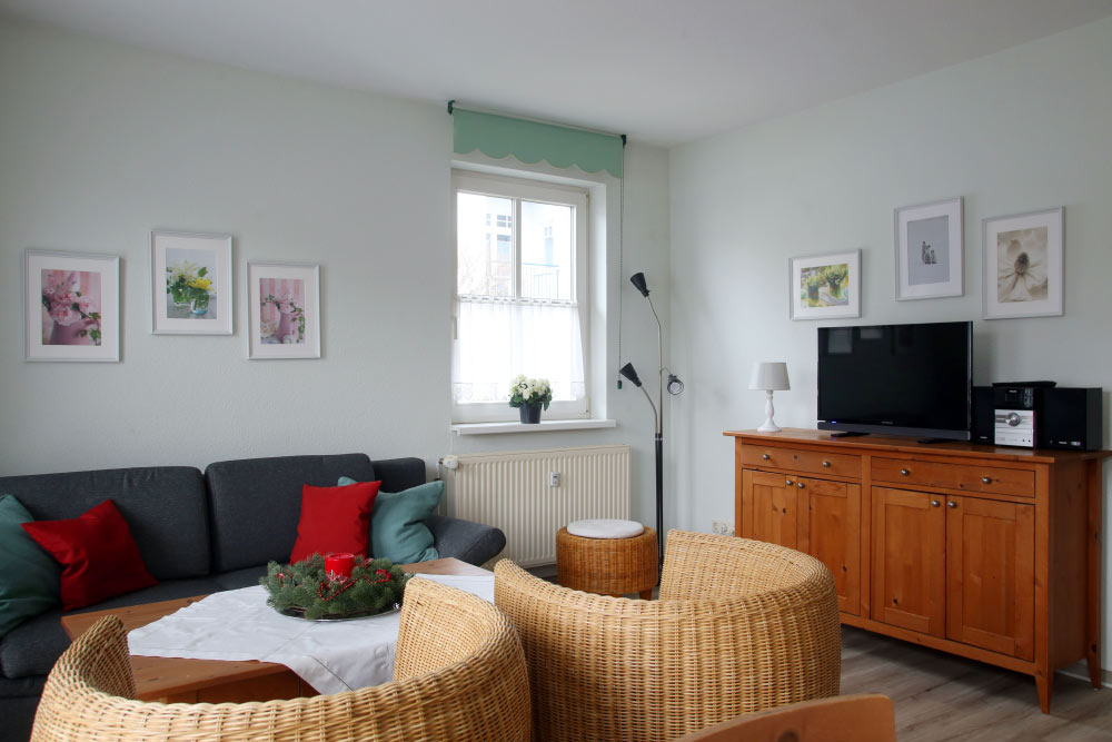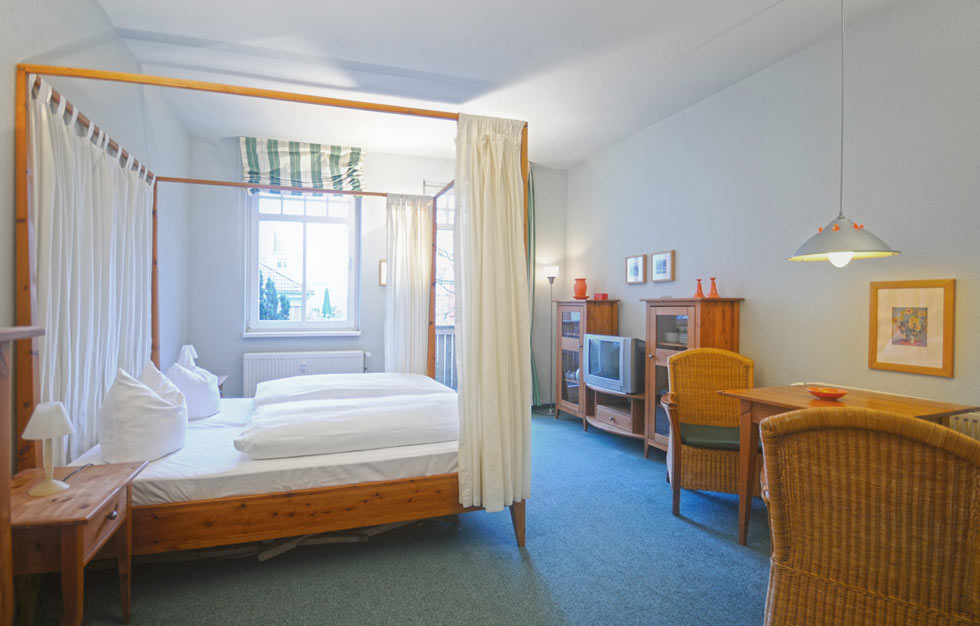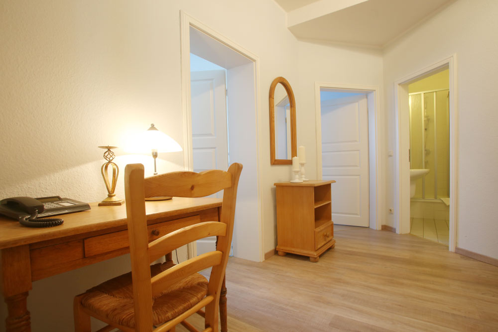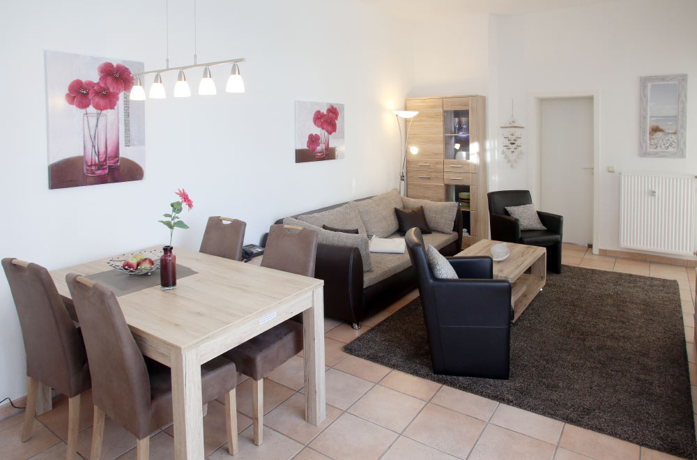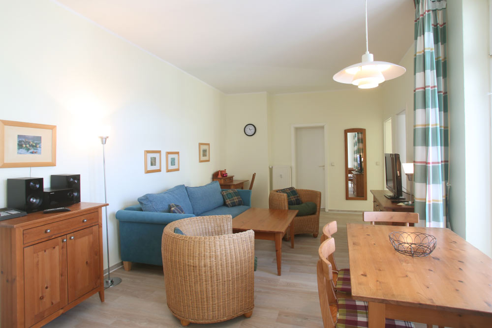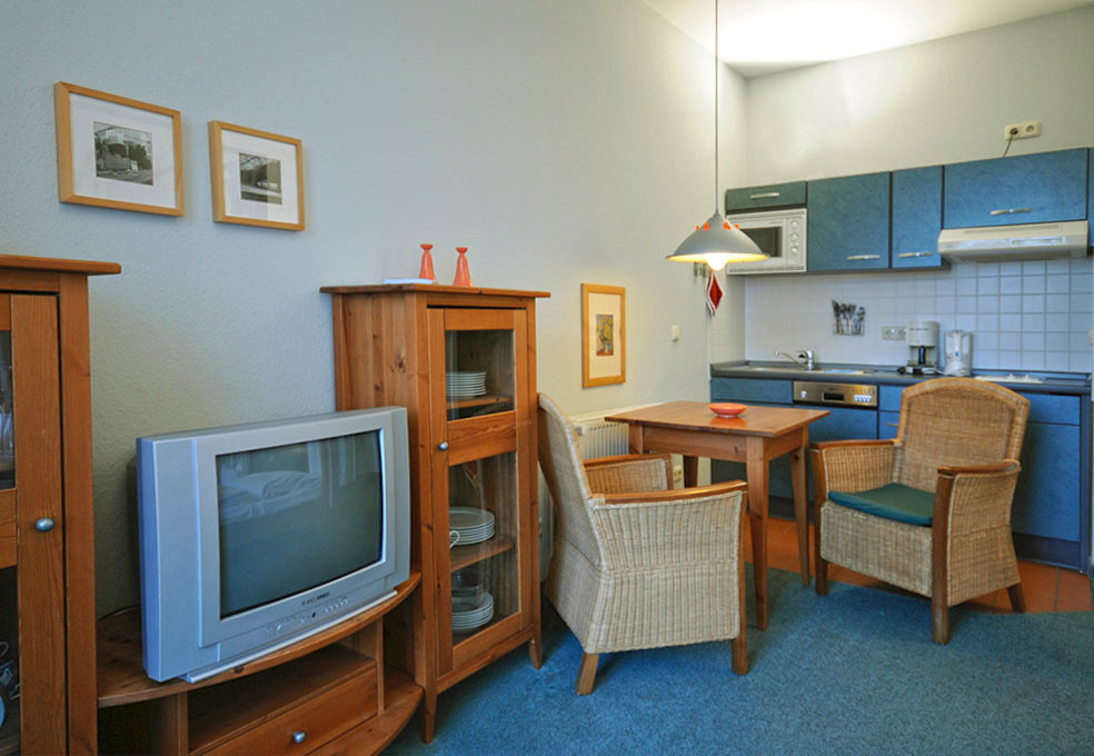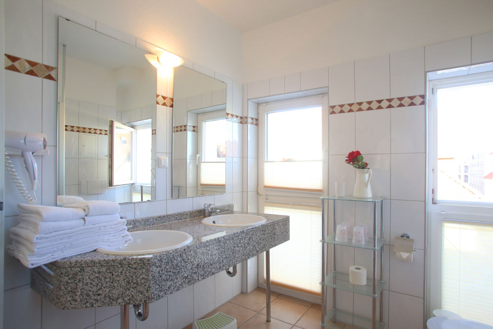 Eine große Maisonettewohnung mit Blick auf die Ostsee von der Dachterrasse steht Ihnen im Dachgeschoss unserer Appartementanlage zur Verfügung. Die Wohnung ist etwa 80 m² groß und verfügt über einen großen Wohnbereich mit offener Küche und Essbereich und Balkon. Hieran schließen ein Schlafzimmer mit Doppelbett an, welches ebenfalls über einen Balkon verfügt, und ein modern eingerichtetes Bad mit Eckbadewanne. Über eine Wendeltreppe erreichen Sie das Turmzimmer, welches mit einer Schlafcouch ausgestattet ist. Über das Turmzimmer gelangen Sie auf die große Dachterrasse über den Dächern von Kühlungsborn mit herrlichem Rundumblick. Die 3-Zimmer-Appartements verfügen über einen Wohnraum mit vollausgestatteter Küchenzeile, ein Schlafzimmer, ein Kinderzimmer mit Doppelstockbett sowie ein Badezimmer. Die Couch im Wohnzimmer kann in einigen Appartements ausgezogen werden, so dass bis zu 6 Personen einen angenehmen Aufenthalt haben.