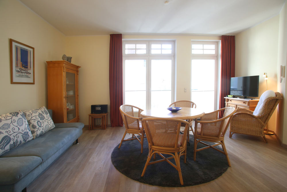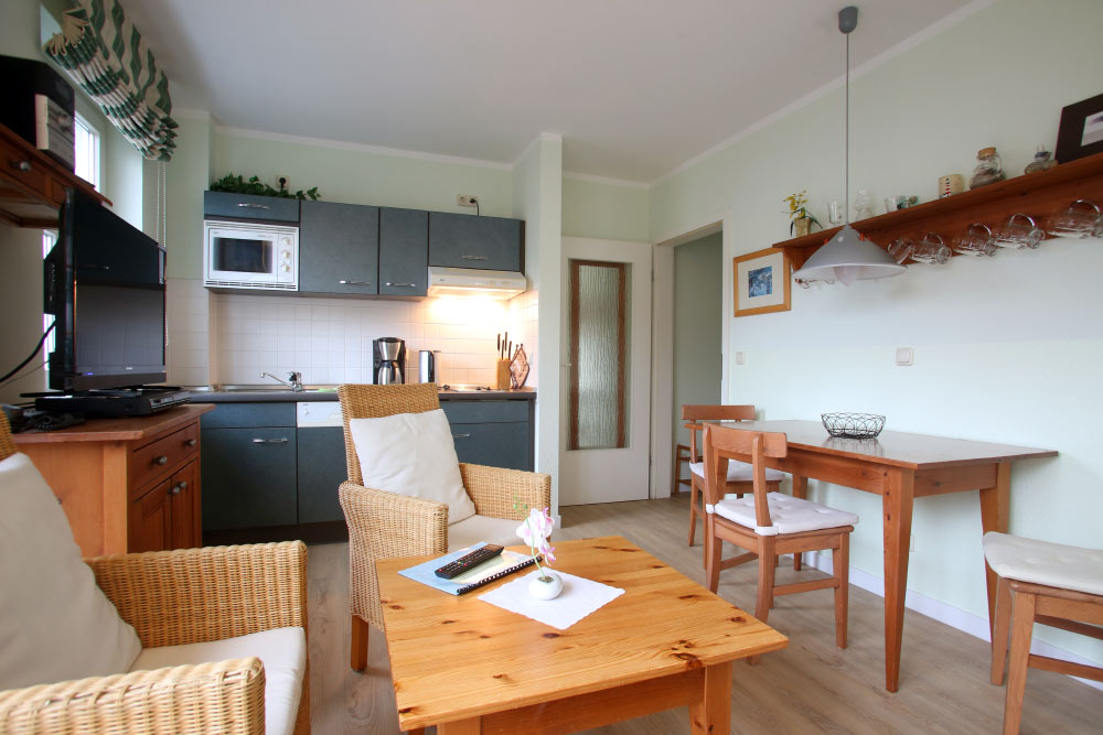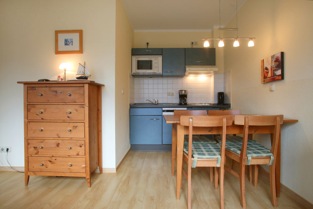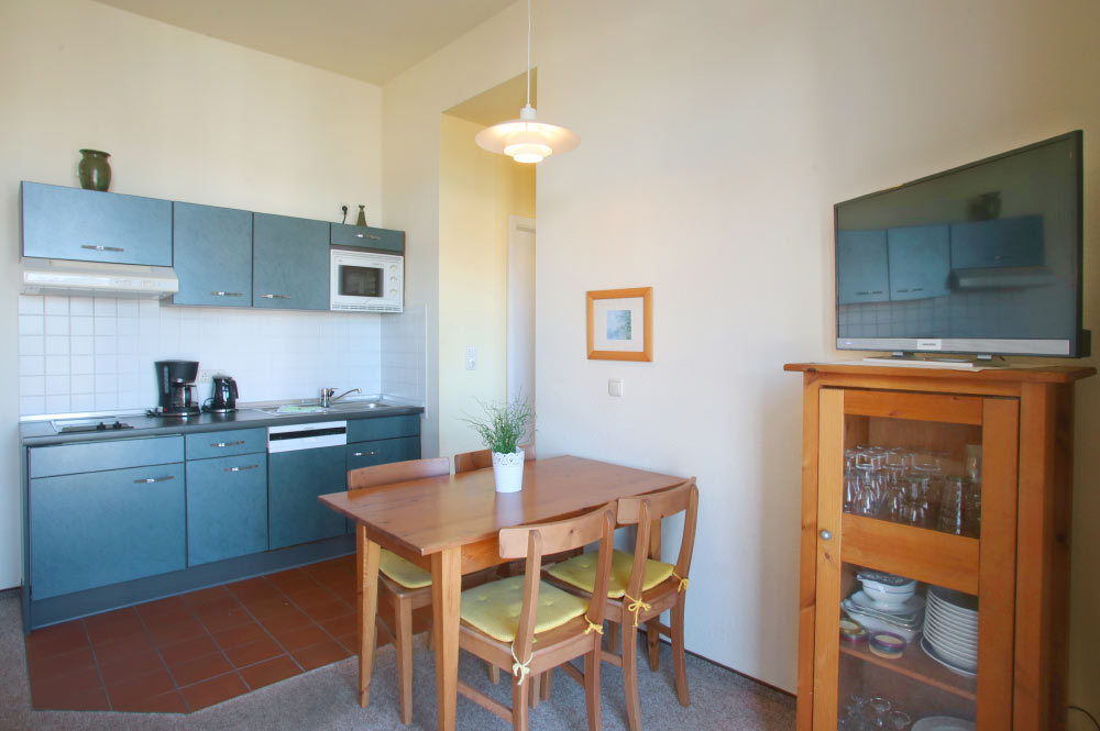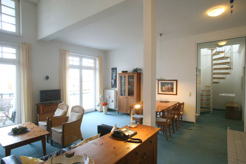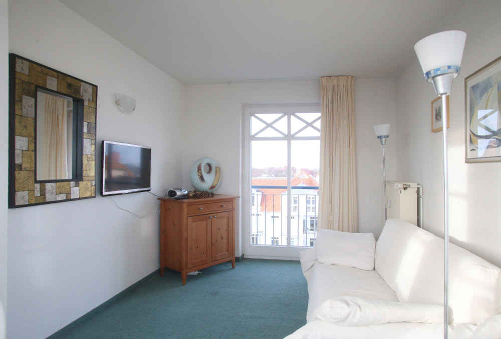 Eine große Maisonettewohnung mit Blick auf die Ostsee von der Dachterrasse steht Ihnen im Dachgeschoss unserer Appartementanlage zur Verfügung. Die Wohnung ist etwa 80 m² groß und verfügt über einen großen Wohnbereich mit offener Küche und Essbereich und Balkon. Hieran schließen ein Schlafzimmer mit Doppelbett an, welches ebenfalls über einen Balkon verfügt, und ein modern eingerichtetes Bad mit Eckbadewanne. Über eine Wendeltreppe erreichen Sie das Turmzimmer, welches mit einer Schlafcouch ausgestattet ist. Über das Turmzimmer gelangen Sie auf die große Dachterrasse über den Dächern von Kühlungsborn mit herrlichem Rundumblick. Die 3-Zimmer-Appartements verfügen über einen Wohnraum mit vollausgestatteter Küchenzeile, ein Schlafzimmer, ein Kinderzimmer mit Doppelstockbett sowie ein Badezimmer. Die Couch im Wohnzimmer kann in einigen Appartements ausgezogen werden, so dass bis zu 6 Personen einen angenehmen Aufenthalt haben.