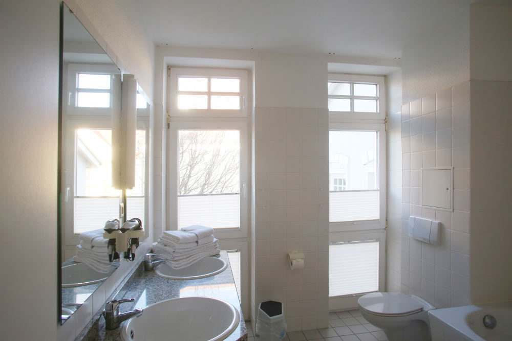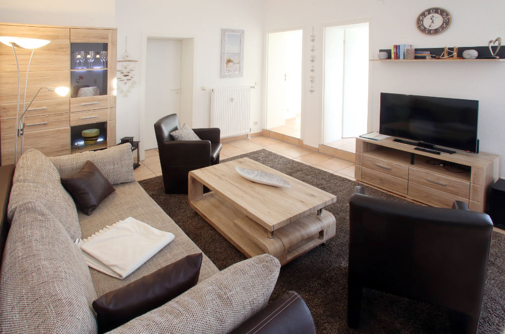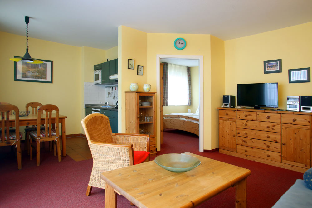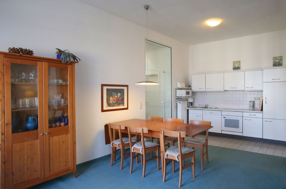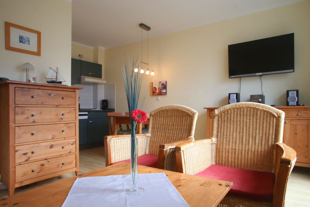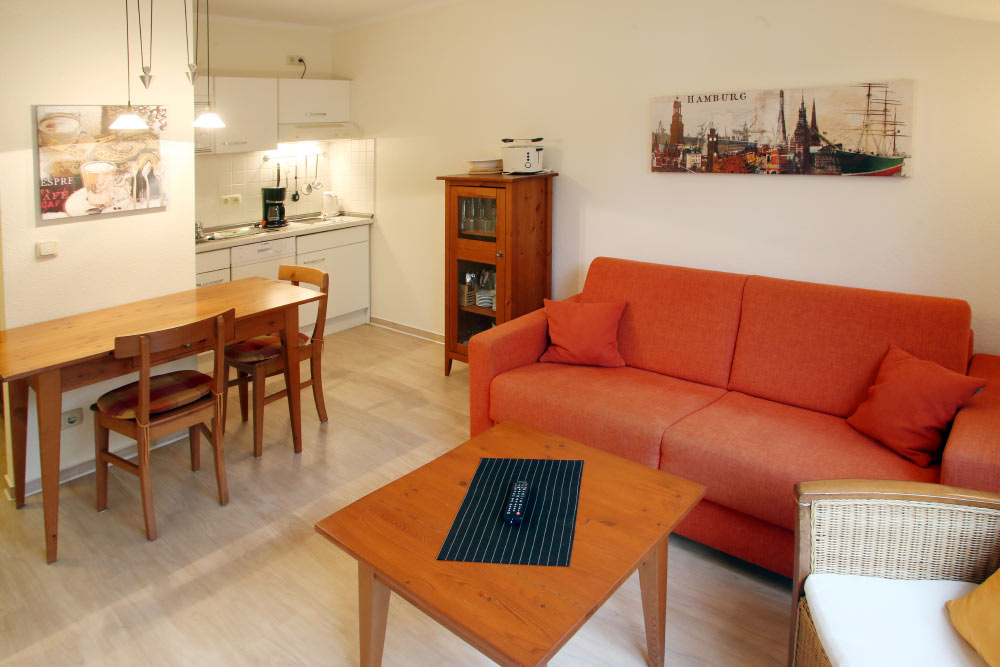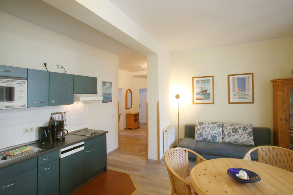Eine große Maisonettewohnung mit Blick auf die Ostsee von der Dachterrasse steht Ihnen im Dachgeschoss unserer Appartementanlage zur Verfügung. Die Wohnung ist etwa 80 m² groß und verfügt über einen großen Wohnbereich mit offener Küche und Essbereich und Balkon. Hieran schließen ein Schlafzimmer mit Doppelbett an, welches ebenfalls über einen Balkon verfügt, und ein modern eingerichtetes Bad mit Eckbadewanne. Über eine Wendeltreppe erreichen Sie das Turmzimmer, welches mit einer Schlafcouch ausgestattet ist. Über das Turmzimmer gelangen Sie auf die große Dachterrasse über den Dächern von Kühlungsborn mit herrlichem Rundumblick. Die 3-Zimmer-Appartements verfügen über einen Wohnraum mit vollausgestatteter Küchenzeile, ein Schlafzimmer, ein Kinderzimmer mit Doppelstockbett sowie ein Badezimmer. Die Couch im Wohnzimmer kann in einigen Appartements ausgezogen werden, so dass bis zu 6 Personen einen angenehmen Aufenthalt haben.