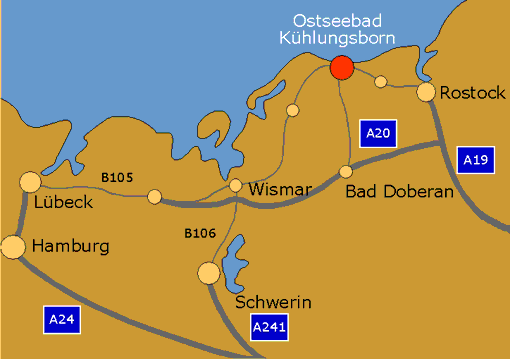 Das Ostseebad Kühlungsborn ist von den nächstgelegenen Küstenstädten Wismar (ca. 40 km) bzw. Rostock (ca. 30 km) entfernt.